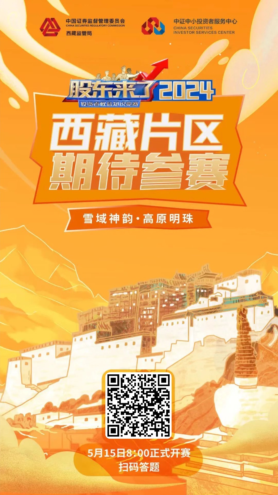 由中證中小投資者服務(wù)中心主辦,上海、江蘇、西藏、深圳證監(jiān)局聯(lián)辦的《股東來了》-2024投資者權(quán)益保護(hù)知識競賽活動于5月15日正式啟動。本次活動采用網(wǎng)絡(luò)答題方式,分設(shè)上海、江蘇、西藏、深圳四大片區(qū),掃描下圖二維碼即可參與“西藏賽區(qū)”答題活動,請全體同仁踴躍注冊并積極參與。